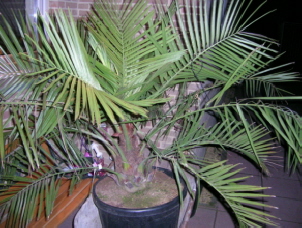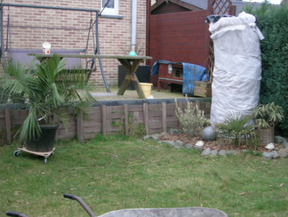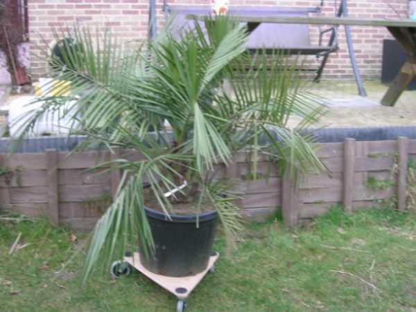 Hij heeft deze winter bij de handelaar gewoon buiten gestaan in die pot....Ongelooflijk nietwaar. Zoals je kan zien ziet die er nog fris groen uit. We zijn nog aan het denken voor een plaatsje. Ik heb er een fototje bijgevoegd waar we hem zouden plaatsen. Hij staat nu nog op wieltjes dus we testen even uit. Merk op dat je in dit geval u moet houden aan de wetgeving: deze boom wordt groter dan 2 meter dus 2 meter van de buur blijven.... We dachten even om hem nog te plaatsen in de zwarte bak van de canariensis maar ik wil geen enkel risico. Deze palm is al 15 jaar dus om dan in een pot te steken.....Daar hij al wat groter is kan hij beter tegen het vriezen en is al wat sterker. Er wordt aangeraden in het najaar er een dakje boven te maken..