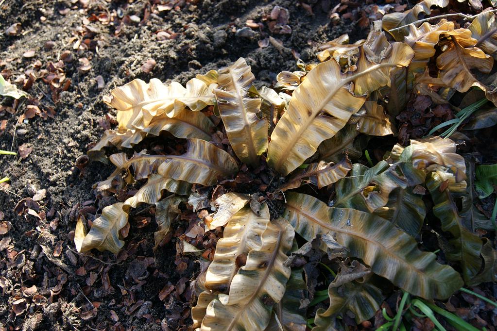 Asplenium (onbekende soort) - ZW - Afgedekt met mulch - veel bladschade door kou+vocht - dubieus