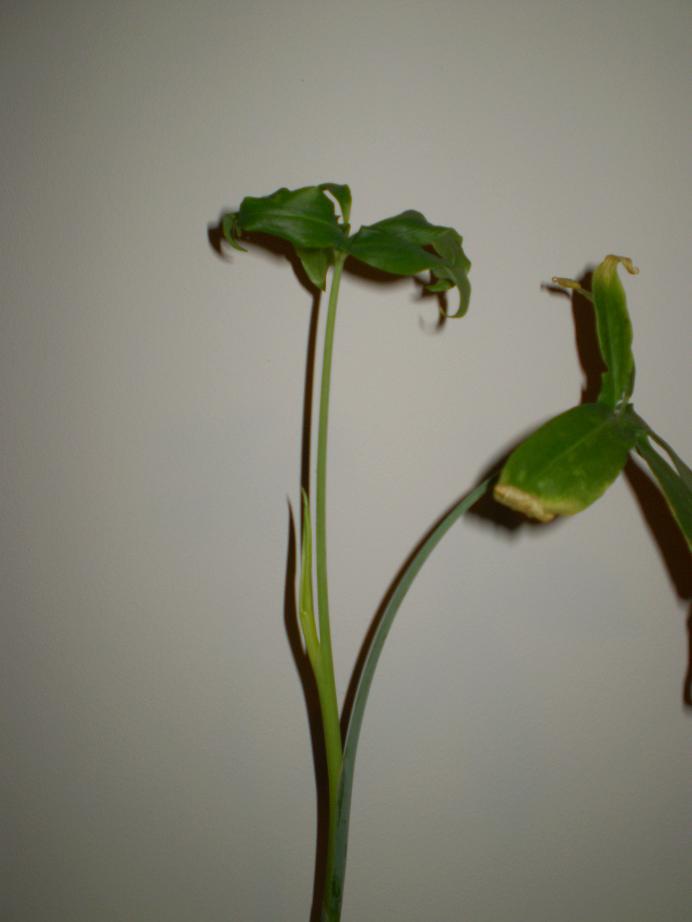 Naast de 'gewone' Dracunculus vulgaris' heb ik nog 2 jonge plantjes staan van Dracunculus canariensis. Ik heb deze 2 jaar geleden gekocht als jonge plantjes via E-bay. Deze planten hebben nu allebei een klein knolletje aangemaakt en beginnen nu opnieuw te groeien.