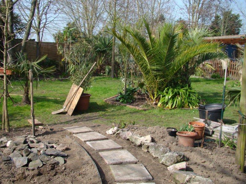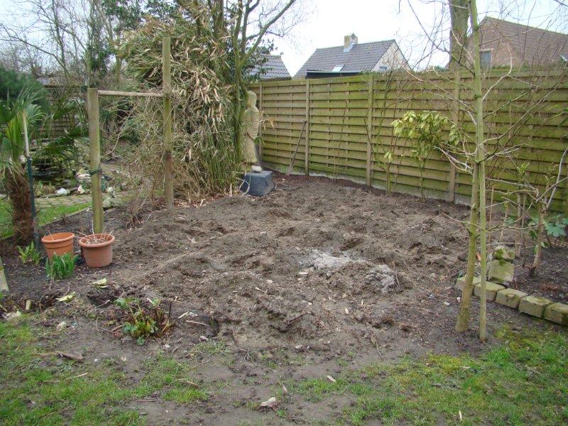 Hier enkele foto's van ons nieuw project : het tuinhuis op palen werd afgebroken, een wandelpaadje aangelegd, en op de vrijgekomen ruimte is oa. plaats voor een driestammige trachycarpus. Ook is er een plaats voorzien voor de maurelli.