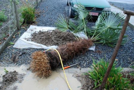 Dit is de reden waarom ik bij elke aangekochte palm (zelfs een trachy) de wortelkluit afspoel in de lente en deze oppot naar een grote potmaat. De eerste jaren laat ik deze een goed wortelgestel aanmaken en overwinter ik deze vorstvrij. Nadien ga ik deze stilaan terug afharden door hem bij matige vorst buiten te laten (met de kluit beschermd).
