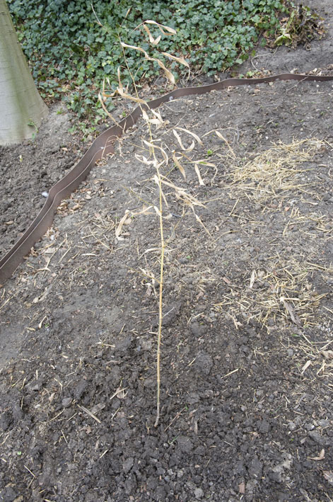 Als er onder dat sprietje een kluit van 50 kg zit zou je misschien een bos van 3 m kunnen krijgen dit jaar. Maar daar ga ik niet vanuit, omdat het net zo'n klein sprietje is (zou anders wel dikker geweest zijn) , en ook omdat hij afgevroren is.