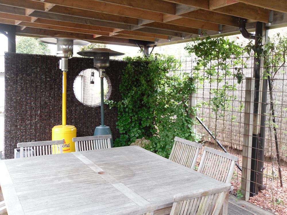 Als laatste zijn we een staantafel aan het maken met daarboven een leiconstructie. We hebben een staalnet genomen en een vorm uitgeslepen, alles bedekt met bekaert draad en grijs gespoten om zo weinig mogelijk op te vallen in de lucht. Vorig jaar hadden we reeds de paal in de grond verankerd en 3 druivenstokken aangeplant(1 blauwe en 2 witte). Was de bedoeling om ze eerst tot 3m te laten uitlopen en daarna de constructie er omheen te bouwen(anders te weinig zonlicht onder de constructie). Daarnet het tafelblad er over geschoven en het bovenste gedeelte(net en paal) erop gelast. Nu nog alles verven en de ledverlichting erop aansluiten en dan de plant langzaam leiden.