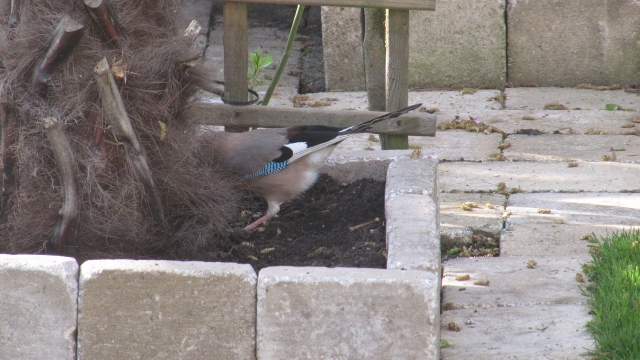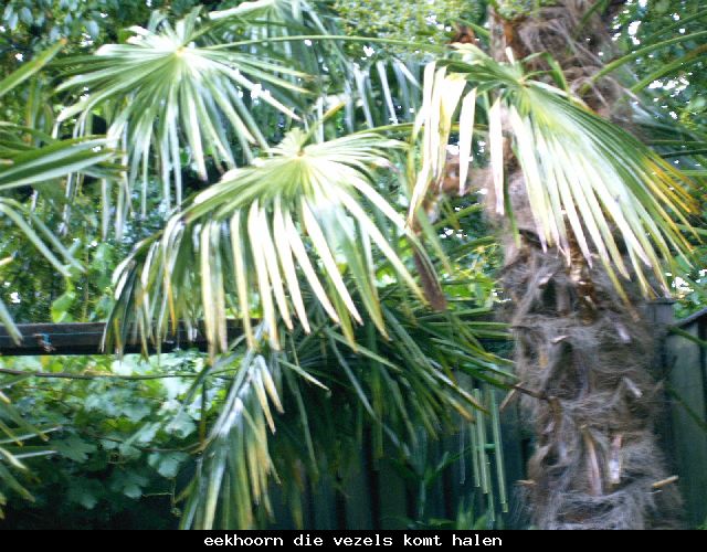 Op foto's zijn vlaamse gaaien in aktie, waarschijnlijk gebruiken ze de draden van de stam voor het bouwen van hun nest. Er is ook al een stelletje eksters en een duif aan de satm aan het trekken geweest. Ik laat het maar zo, zo krijgt een uitheemse boom een inheemse funktie en weet de fauna de trachy te waarderen.