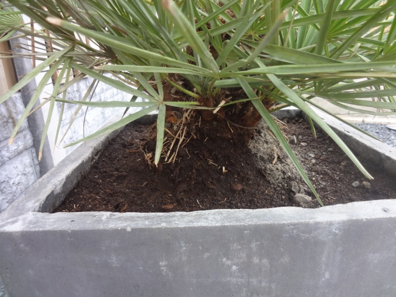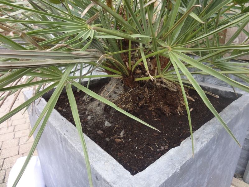 Hij staat in palmaarde met zand vermengt