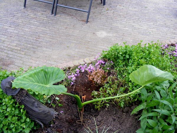 Vandaag ook de Alocasia]macrorrhizos in de volle grond gezet achter het huis, uitlopertje staat in de volle grond in de voortuin. Ik ga hier veel van verwachten! :)