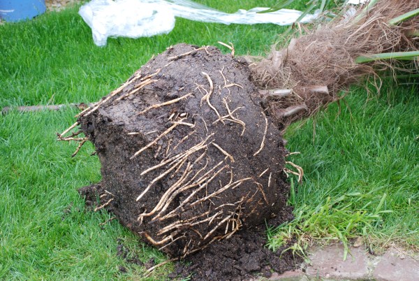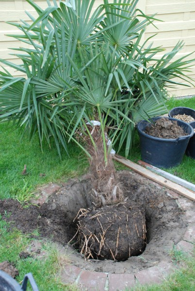 Plantgat waar al redelijk veel wortels aanwezig waren van de vorige bewoner (Trachycarpus) :)