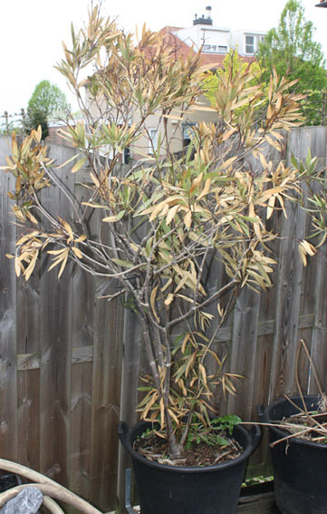 Ze hebben (heb er 2 maar deze is het slechtst aan toe) de afgelopen winter binnen gestaan, waar het achteraf blijkt niet helemaal vorstvrij was. Toch bleven ze binnen groen en werd hij pas geel toen ik ze naar buiten haalde. Mijn vraag is komt dit nog goed of kan ik hem afschrijven. Misschien heeft iemand een tip bijv. snoeien om hem op te peppen.