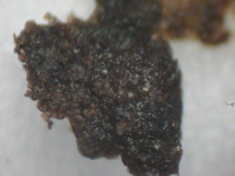 Ik heb het staaltje onder de stereoscoop gelegd (zie bijlage) En wat eerst op faeces leek, lijkt nu op (zwarte) kaviaar (eitjes dus) met hier en daar een wit bolletje in.