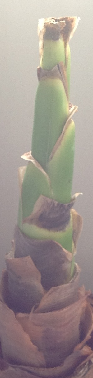 Dan besloot ik er een stuk af te snijden of er iets van nieuw blad te zien was en dat was er wel, maar waar dit bij andere bananen al na 1 dag een aantal centimeter hoger staat deed deze bijna niets, en nu op dit moment is hij op het punt gekomen dat dit nieuw blad nu een 20 cm lang is, nog steeds op weg.....