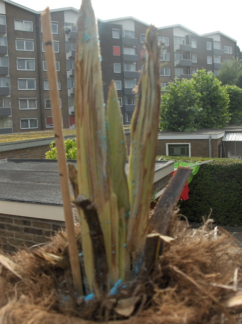 @Harold: ik heb de palm (helaas)niet beschermd afgelopen winter. Hij staat inmiddels 4 jaar in de volle grond (bij mij). Voorgaande jaren heb ik een hoeslaken over het bladerdek en de speer gebonden en iedere dag de sneeuw eraf geveegd. Dit jaar zat ik in Malaga onder een andere palmboom.... voordat ik op vakantie ging, waren de meeste exoten in mijn tuin nog groen, toen ik terugkwam waren ze bruin! Ik ga nooit meer naar Malaga.... :roll: