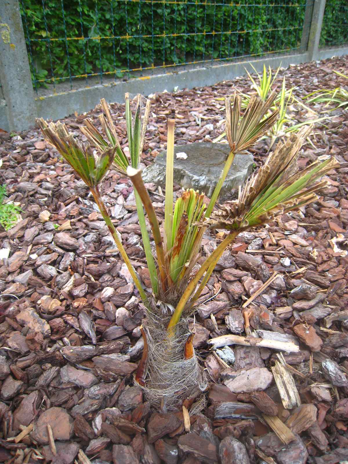 Na dit tropische weekend zien de planten er gelukkig beter en beter uit, enkele herstellen goed anderen blijven dan weer steken. 2 van de 5 kleine trachy's zijn aan de groei, 2 zijn dood en van 1 weet ik het niet, blijven duimen dus :thumb_up: Ook de brahea is goed bezig, jammer van de schade! anders was hij al bezig aan zijn derde blad :shock: