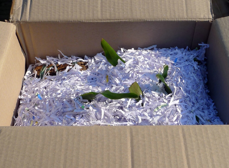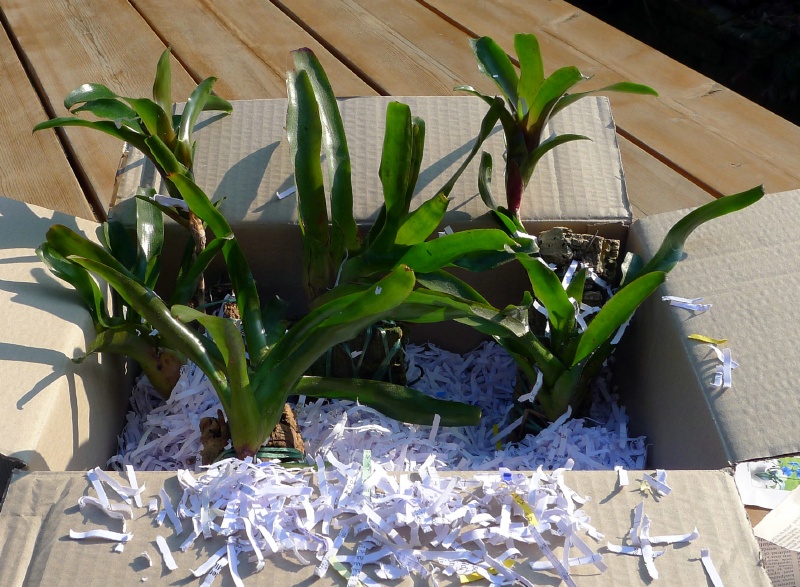 Doos met verpakkingsmateriaal en bromelia's.