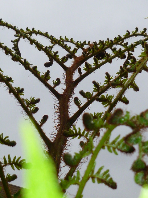 De kromme D.Sellowiana wat bijgetrimt beetje met beetje want veren waren de hoogte in gegaan omdat deze tss grotere boomvarens bij Ponga in de kas stond en opzoek moest gaan naar licht..