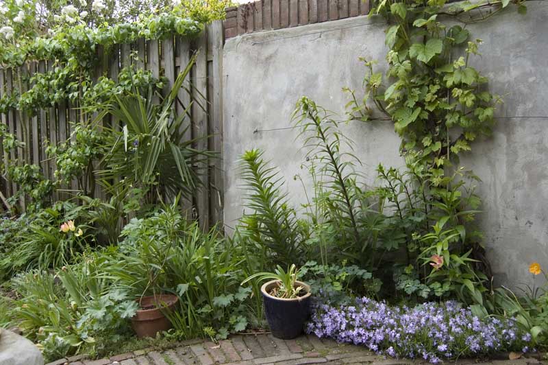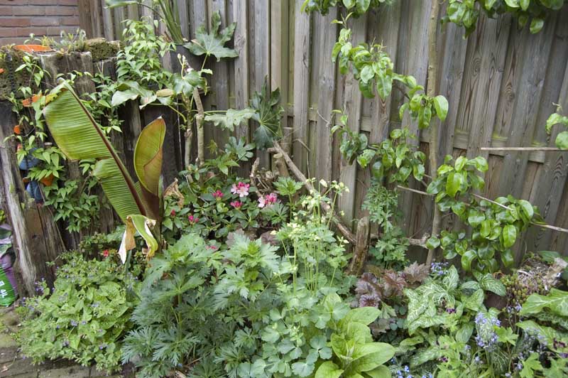Heel gezellige tuin! ik zie veel planten die wij ook hebben. De musa basjoo groeit bij ons ook nog amper hoor. De tetrapanax wel, die heeft al 5 bladeren, nog niet groot, maar dit jaar gaat ie eindelijk lekker aan de groei. Staat je grotere trachy niet heel erg dicht bij de schutting?? Die heeft dalijk best wel wat ruimte nodig hoor, maar het kan ook een vertekening van de foto zijn. Dracunulus gaat hier ook voor het eerst lekker!