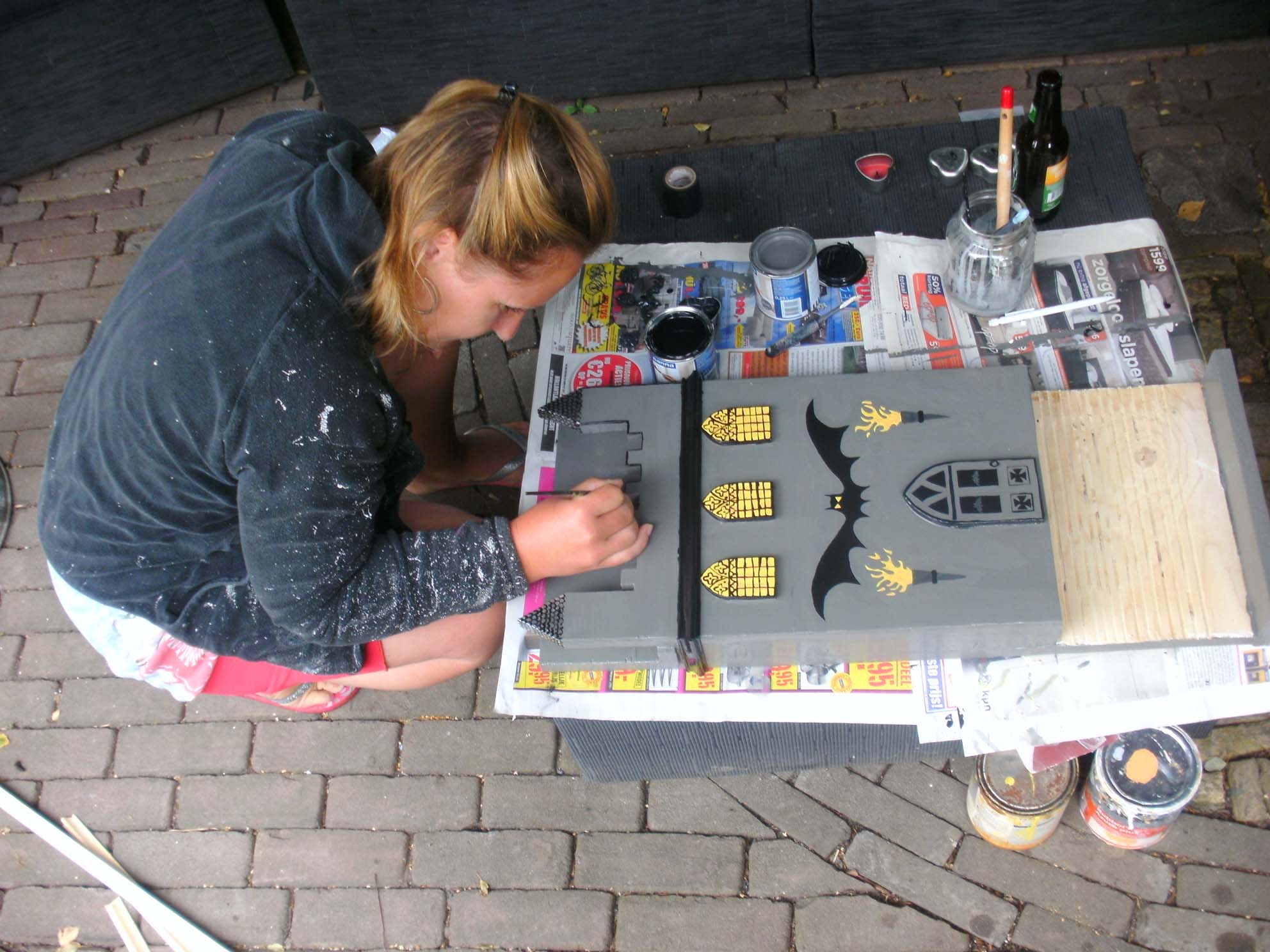 Hey Dimi, we hebben alle vereisten voor een vleesmuisverblijf van internet geplukt, hoe dik , hoe breed hoe hoog het kastje moet zijn, verder moet het ruw hout zijn en de vliegingang echt heel smal, ik geloof dat de ingang maar 1,5 cm breed is en het verblijf zelf maar 3 cm erg plat dus. Verder moet ie dalijk 3 minimaal 3 meter hoog hangen, op het zuiden of zuidwesten zodat de zon (als de zon schijnt tenminste) het verblijf kan opwarmen. Wij zijn ook zeer benieuwd of de woning dalijk bewoont zal zijn. Ik wacht nu nog op wat houten ornamenten die op het kasteel komen en dan nog wat schilderen en dan kan ie de bomen in (letterlijk en figuurlijk)