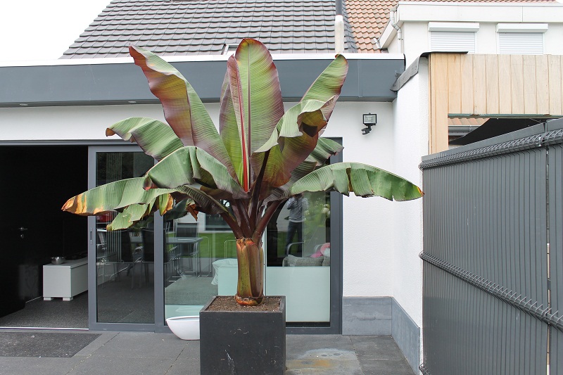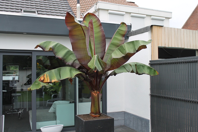 Links in beeld een groepje basjoo die met ruim 1 mtr stam op zolder heeft overwinterd en pas laat in het voorjaar de volle grond is ingegaan. Daarvoor zoveel als mogelijk was, in de volle zon en vaak aan moeten knippen