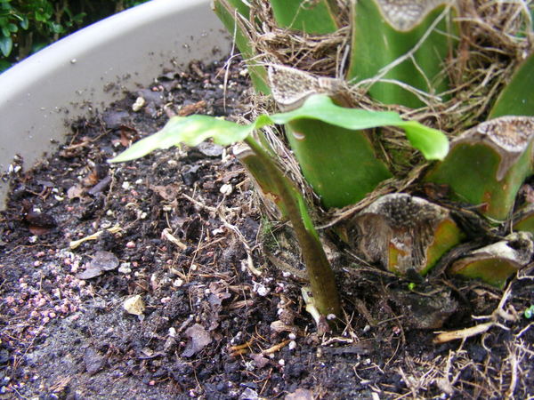 Er komt zojuist een bananen/alocasia achtige naast mijn Roebelinii op, het voelt als een banaan en het groeit hard.