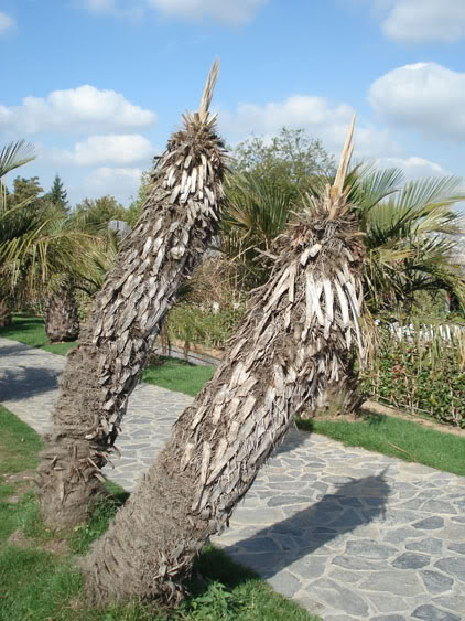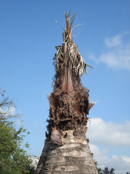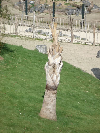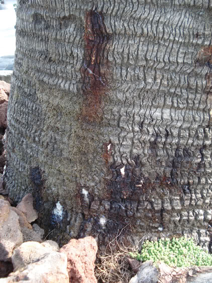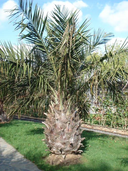 Les deux Jubaeas adultes de chaque côte au pied de l’escalier n’ont malheureusement pas résisté à notre hiver. Ces palmiers estimés à un âge de 80 ans, montrent des signes de pourriture à la lance (photo du milieu) et au pied (photo droite).