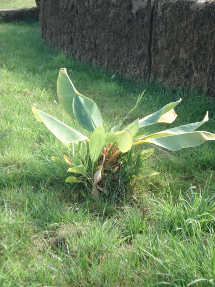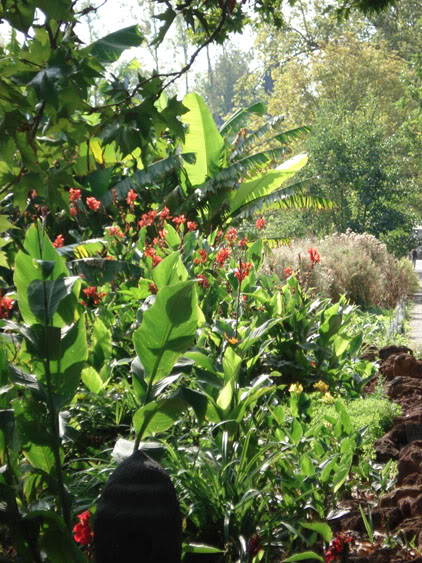 Photo de gauche à droite: Cycas pectinata (hivernage en serre), Musa basjoo en Canna indica (protègés avec de la paille), Musa basjoo en Musa siam ruby (protègés avec de la paille)