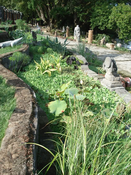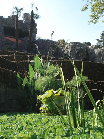 Notre promenade commença aux pieds des escaliers impressionnants. A gauche comme à droite, des terrasses couvertes de pelouse simulent des champs de riz. Seulement les parties inférieures contiennent de l’eau. Ces étangs artificiels ont été directement un grand succes grâce à l’eau très riche provenant du lac. Dans un future projet, toutes les terrasses devront contenir de l’eau pour servir comme de véritables champs de riz. Le plus grand defis dans ce projet est l’etanchéité des bassins.