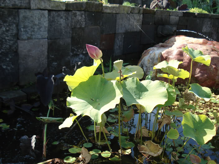 Photo du milieu de l’avant à l’arrière: Typha variegata, Nelumbo nucifera, Papyrus, Thalia dealbata