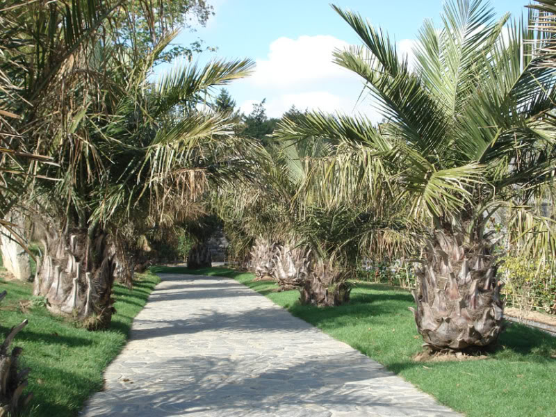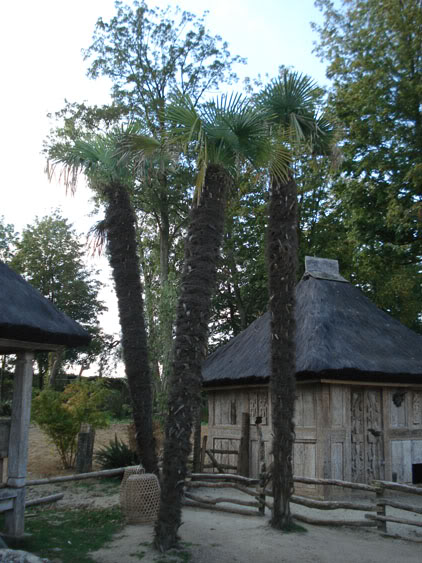 Photo de gauche à droite: Phoenix roebelenii (hivernage en serre), Trachycarpus fortunei (sans protection), Washingtonia robusta (hivernage en serre)