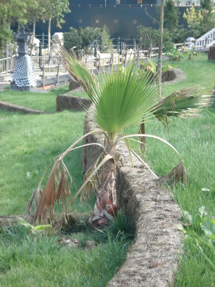 Photo de gauche à droite: Jubaea chilensis (entouré par des plaques de polycarbonate), Musella lasiocarpa (paille et feuille de plastic), Phoenix canariensis (câbles chauffants et entourés par des plaques de polycarbonate)