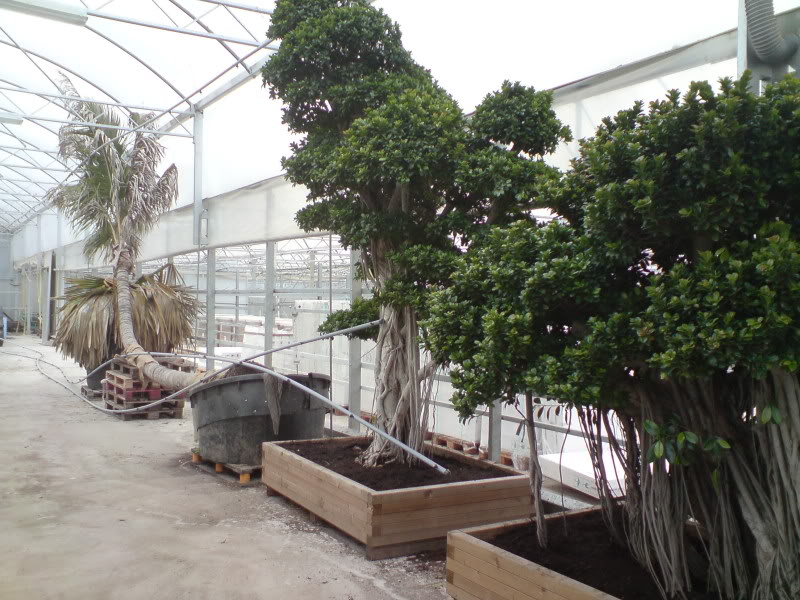 A droite une photo exclusive de l’emplacement hivernal du Cocos nucifera et des Ficus microcarpa “compacta” bonsai (devant).