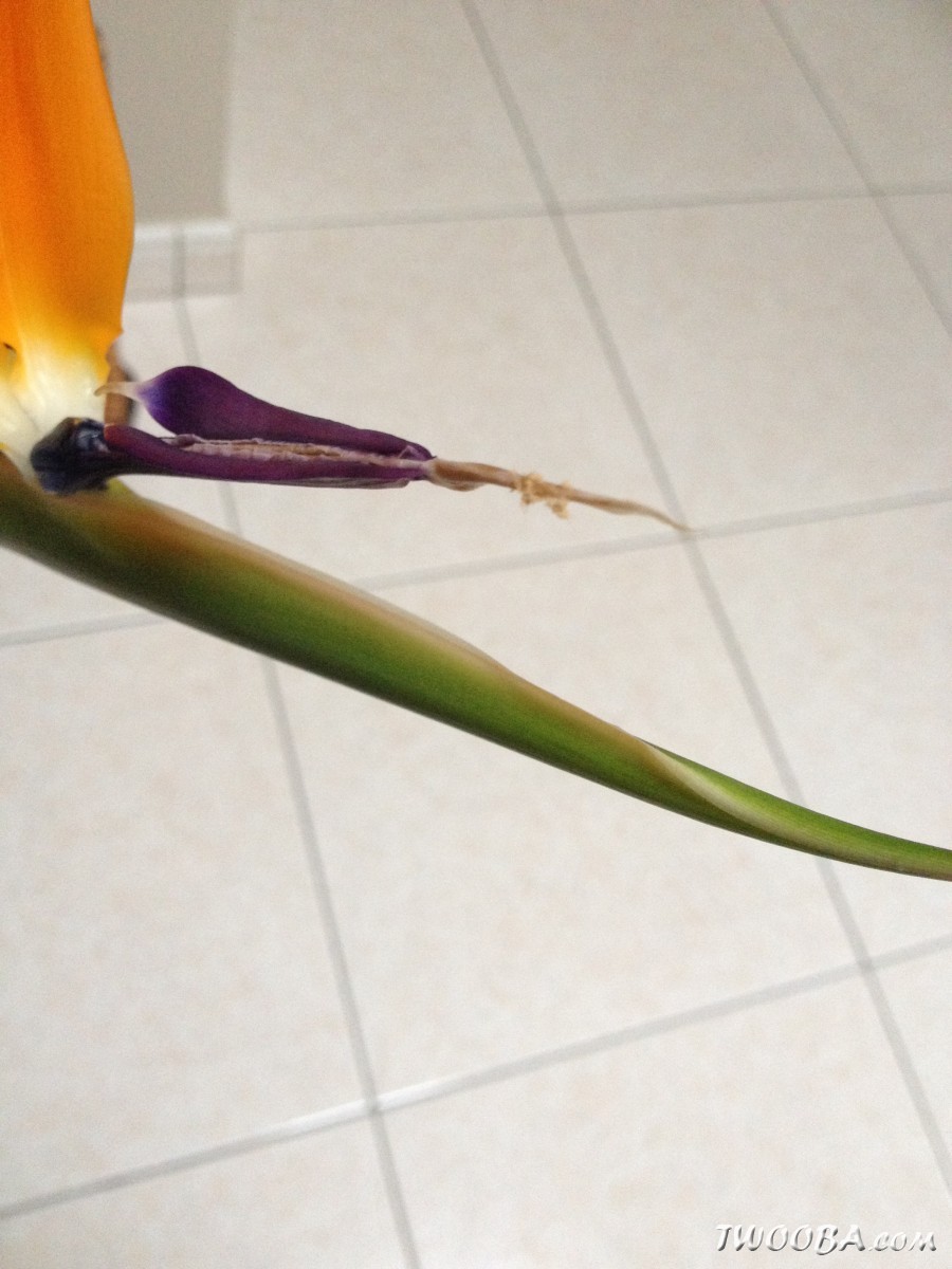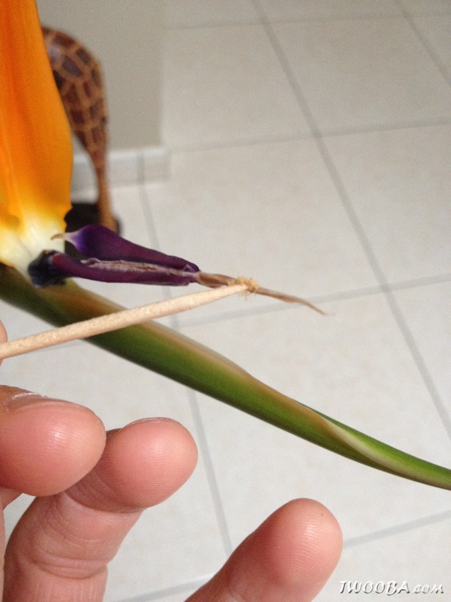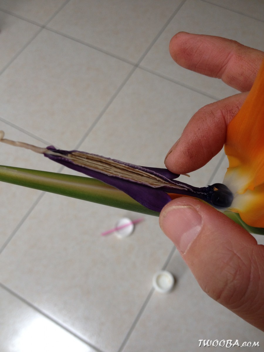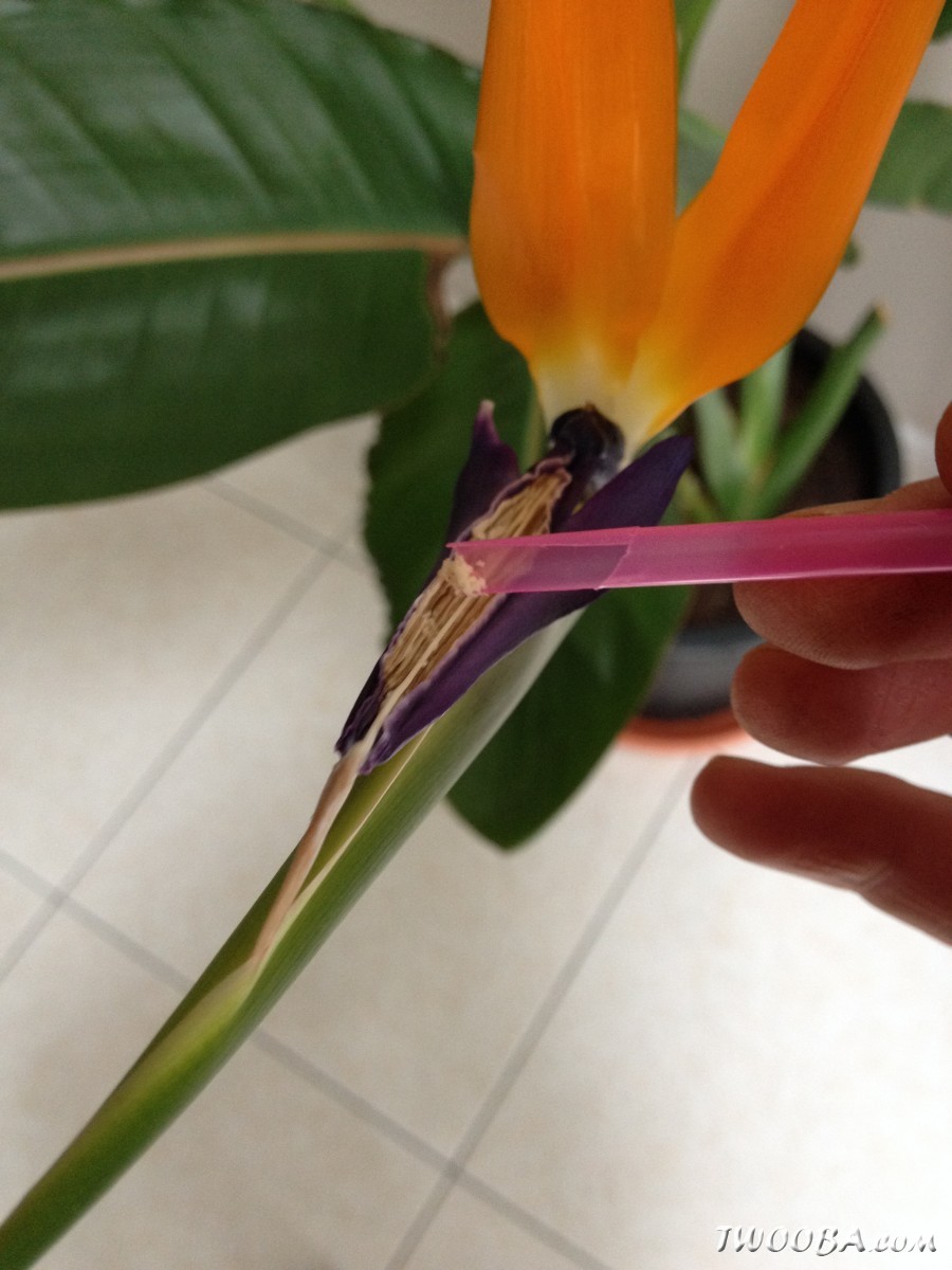 Chaque fleur d’oiseau de paradis à comme une flèche bleue tout au-dessus. A l’arrière de cette partie vous voyez comme deux “ailes”. Quand vous les pincez légèrement la flèche s’ouvre au dessus quand vous pouvez le voir sur la photo dans l’article. Ici se trouve le pollen. Le pollen doit être récolté comme le stigmates sont réceptifs seulement plus tard. Une fois que le stigmate d’une autre fleur, d’une autre plante (comme le Strelitzia ne peut s’auto-polliniser) est collant vous pouvez frotter les pollen sur le stigmate.