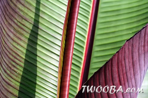 Foliage: banana-like leaf blades of up to 5 m (16 ft) tall by 1 m (3 ft 3 in) wide, on the top varying from green-red/purple and underneath deeply red.