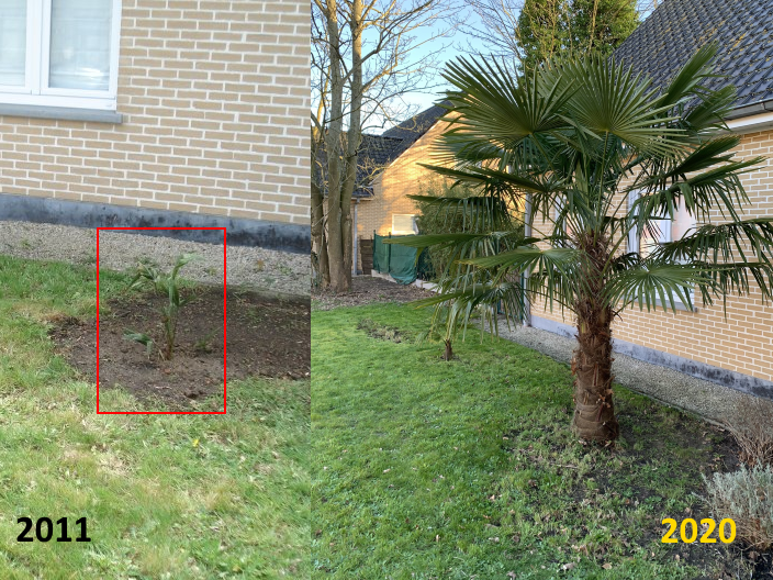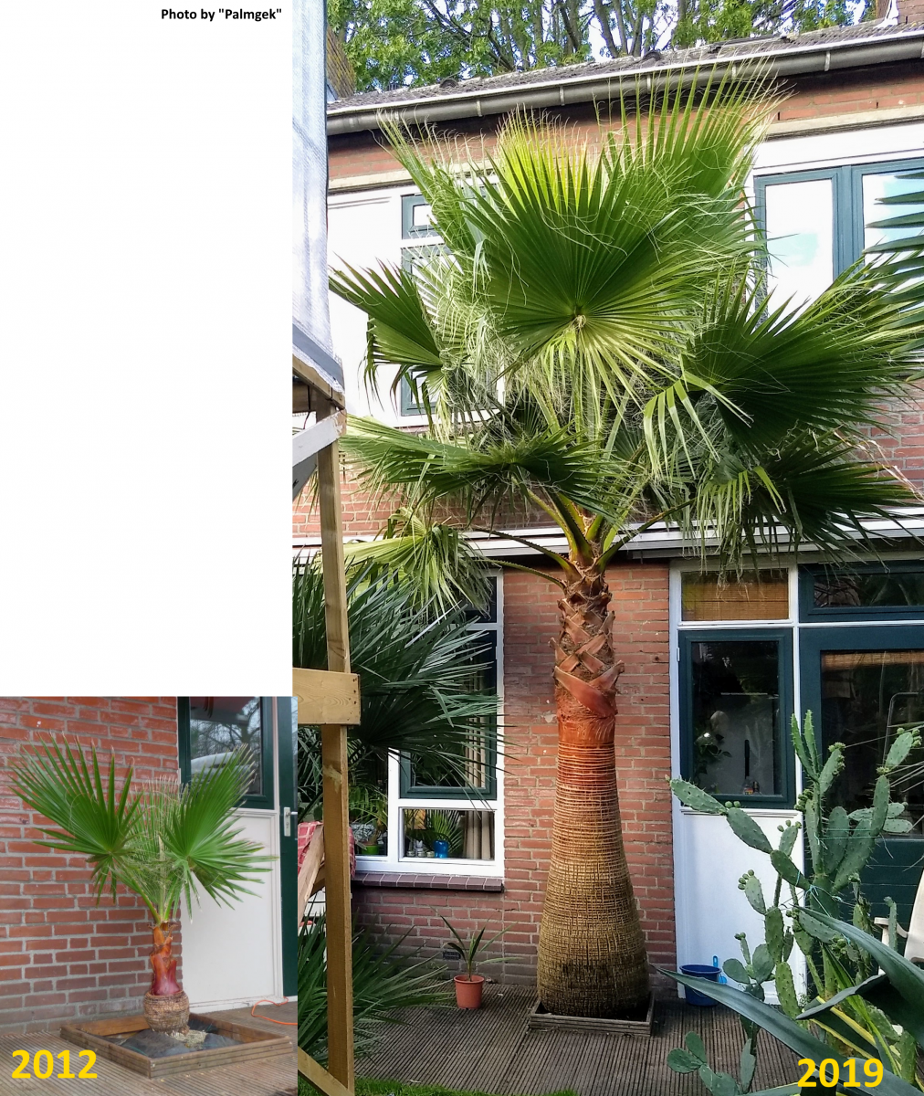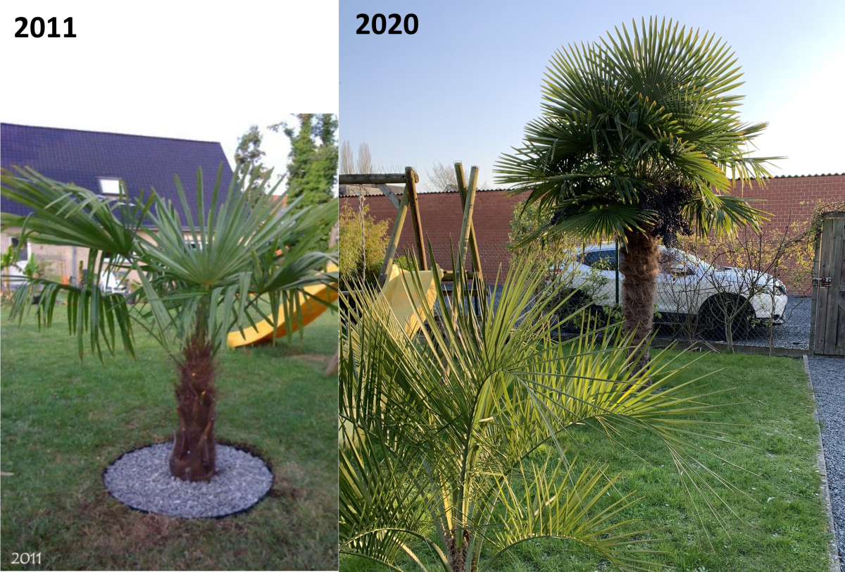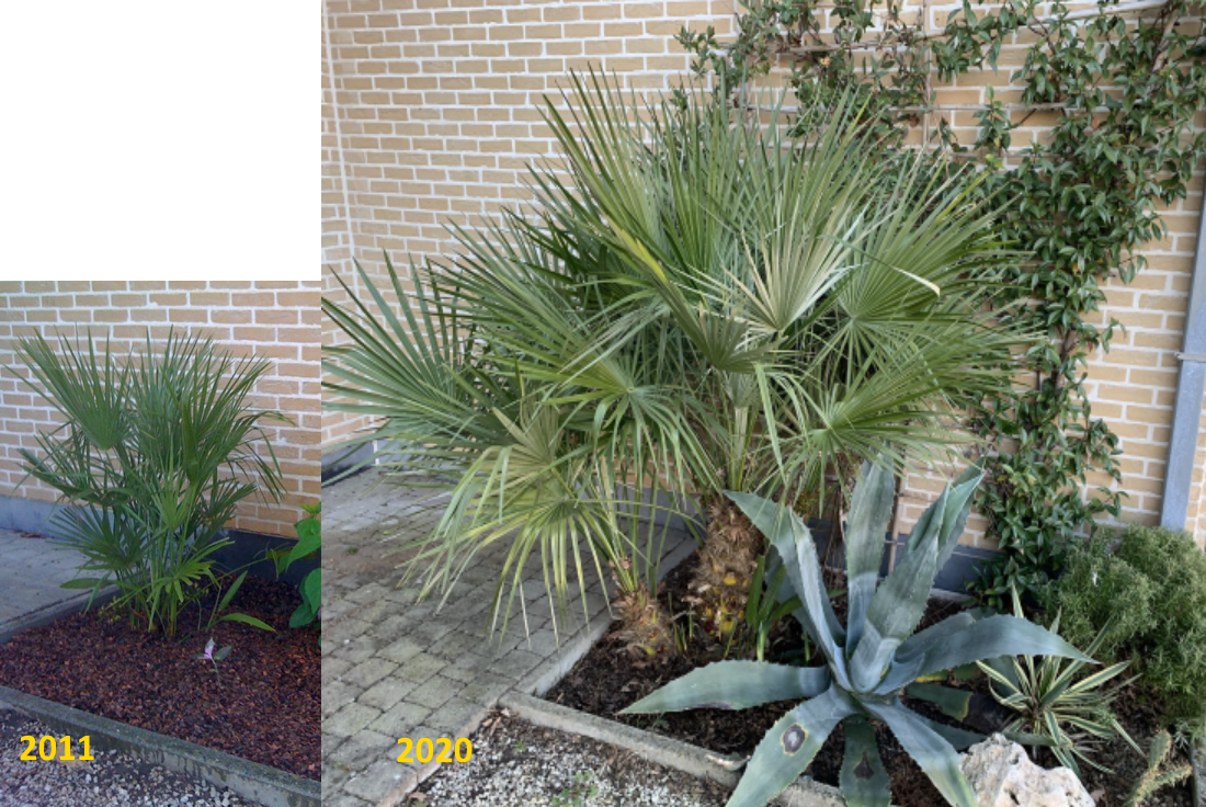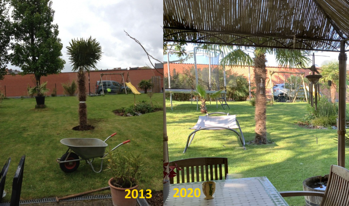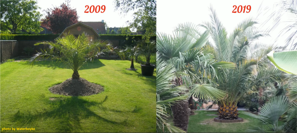 The Chinese windmill palm is actually the palm of choice for almost any garden. Although the final height is about 12 meters it will take many years before the palm is actually that big. So don’t be put off by this. We estimate that the Trachycarpus at the very top of this article is at least 30 years old. The pictures below illustrate the effective growth best. It is striking that smaller planted palms grow much faster than palms plantend when they were already large. It’s an extremely easy palm that grows well in almost any place. It is hardy down to -18°C/-0.4°F and therefore doesn’t really need any real care. It grows best in open ground but can also be kept in pots if desired. Due to its narrower appearance it fits even in smaller gardens.