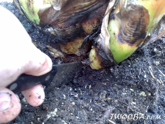 Indien het effectief om een Musa gaat is het inderdaad aangeraden om toch wat wortels aan de stek te laten bij het afsnijden zonder al te veel in de moederplant te moeten snijden. Een beetje kan echter geen kwaad.