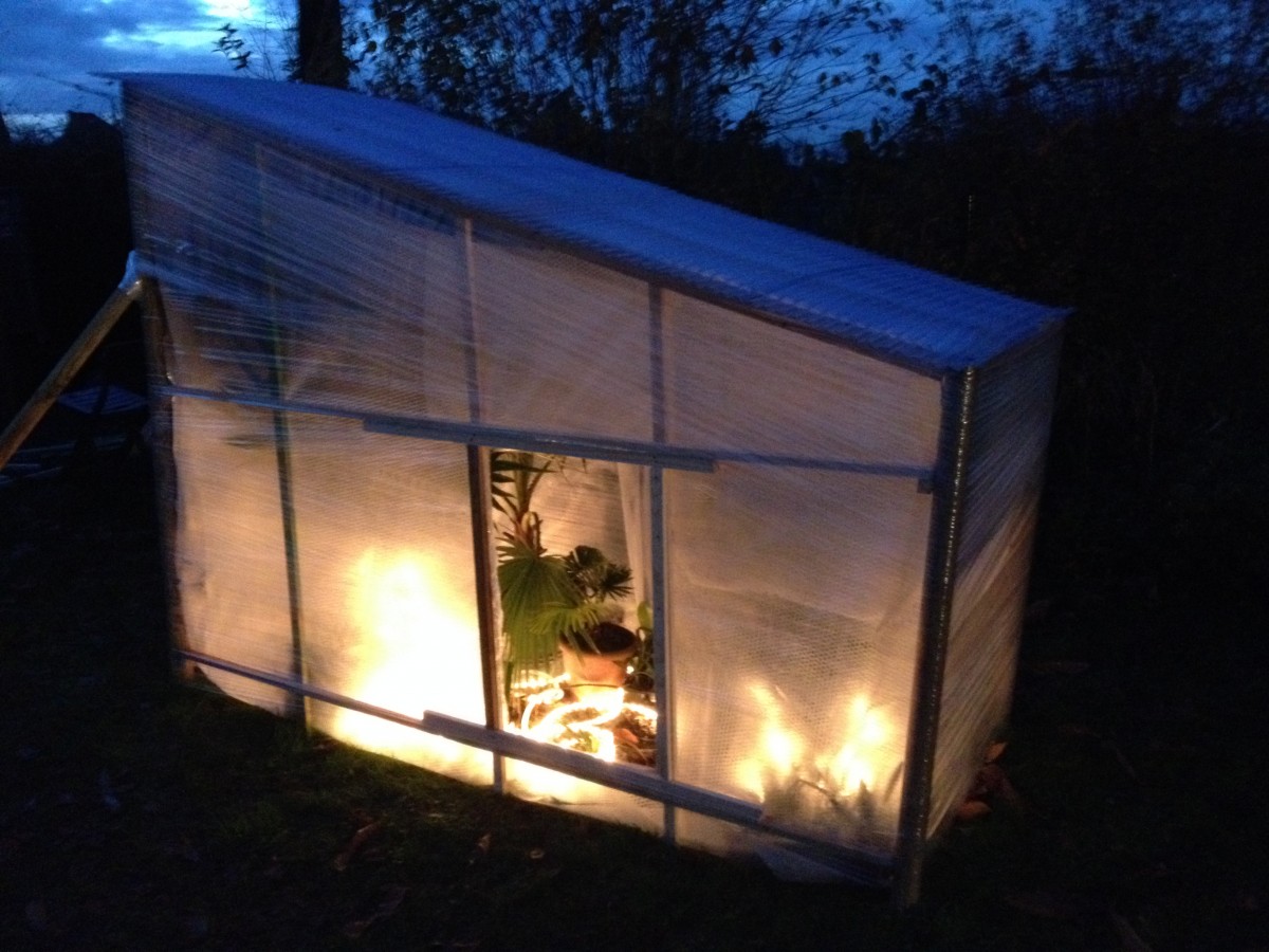 Een degelijk afdak is dan ook de eerste stap. Vaak wordt dit aangevuld met zijwanden van noppenfolie of vliesdoek en een lichtslang rond de palm als warmtebron. Zo kan de temperatuur rond de palm kunstmatig enkele graden hoger gehouden worden dan de buitentemperatuur.