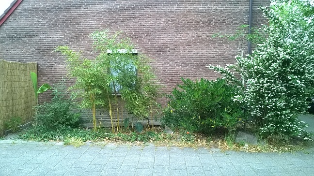 Hierbij de update van de groei van Phyllostachys vivax aureocaulis in 2015. De eerste foto is van juni. De nieuwe scheuten groeien nog behoorlijk scheef. Om dit op te lossen heb ik een schroefhaak in de muur bevestigd en de scheuten met touwtjes rechter getrokken. Op de tweede foto staat alles mooi overeind. Deels door de touwtjes die er nog steeds aan zitten, deels doordat de wind er tegen blaast.