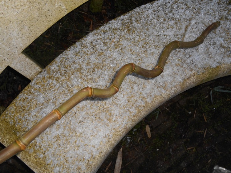 Ph. aureosulcata halmen voelt inderdaad stroef aan, de andere (pigskin) kan ik niet thuisbrengen Aldert? Ph. vivax 'Aureocaulis' heeft een glad aanvoelende halm. Hieronder een mooi voorbeeld van een zigzag halm van de aureosulcata. Deze soort is hier in de tuin van de aanwezige Phyllostachys soorten de meest winterharde gebleken met zelfs onbeschadigd blad na -20°C en onbeschut voor de harde Noordooster.