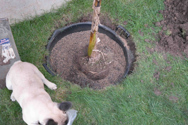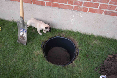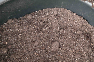 In de kuip zit een mengeling van potgrond, gewone vaste aarde, gedroogde koemestkorrels en beendermeel.