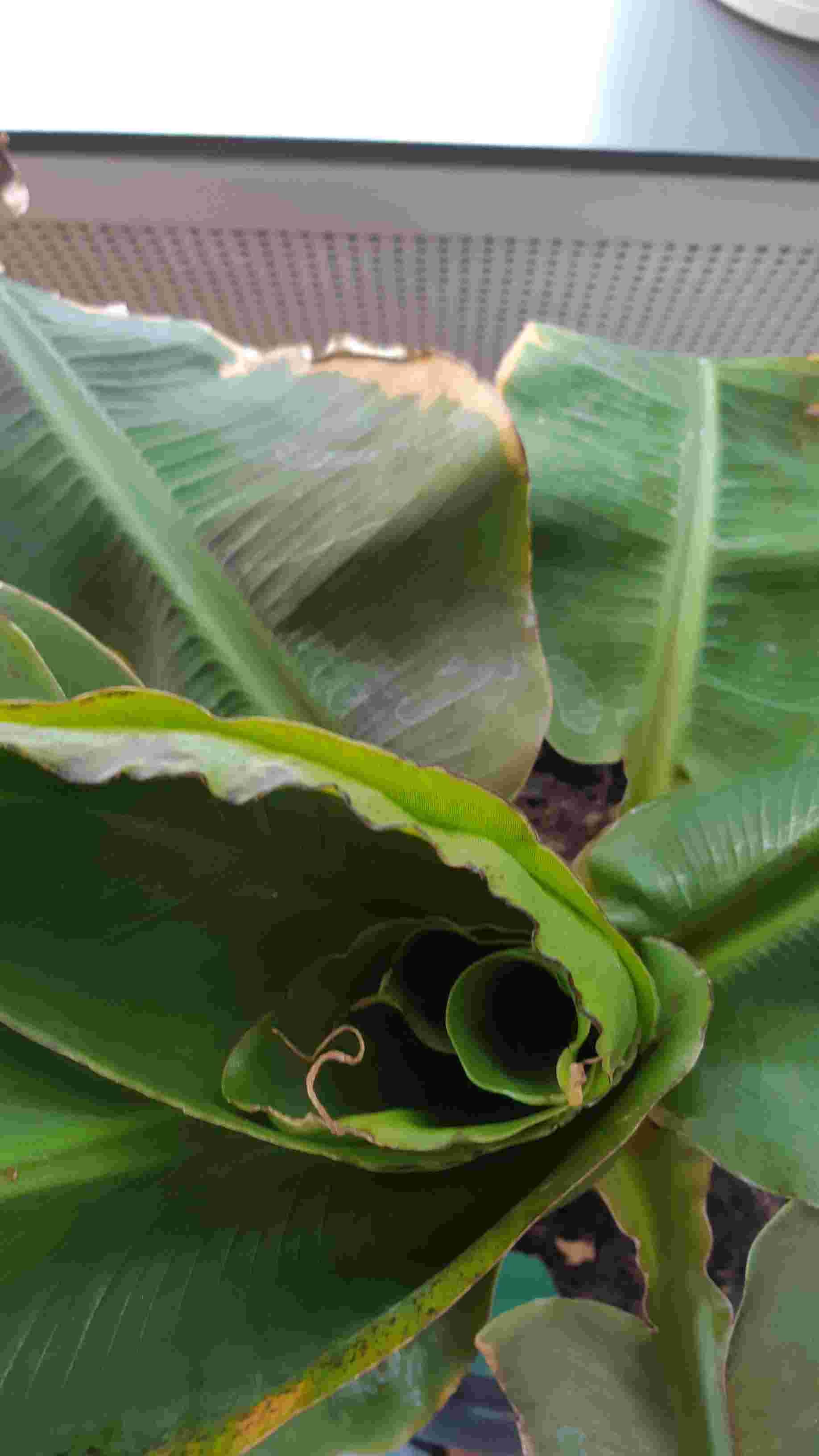 Al een paar weken, of maanden, heb ik dat de bladeren van mijn musa niet goed ontrollen en dat er in dat niet ontrolde blad al een nieuw blad zit.