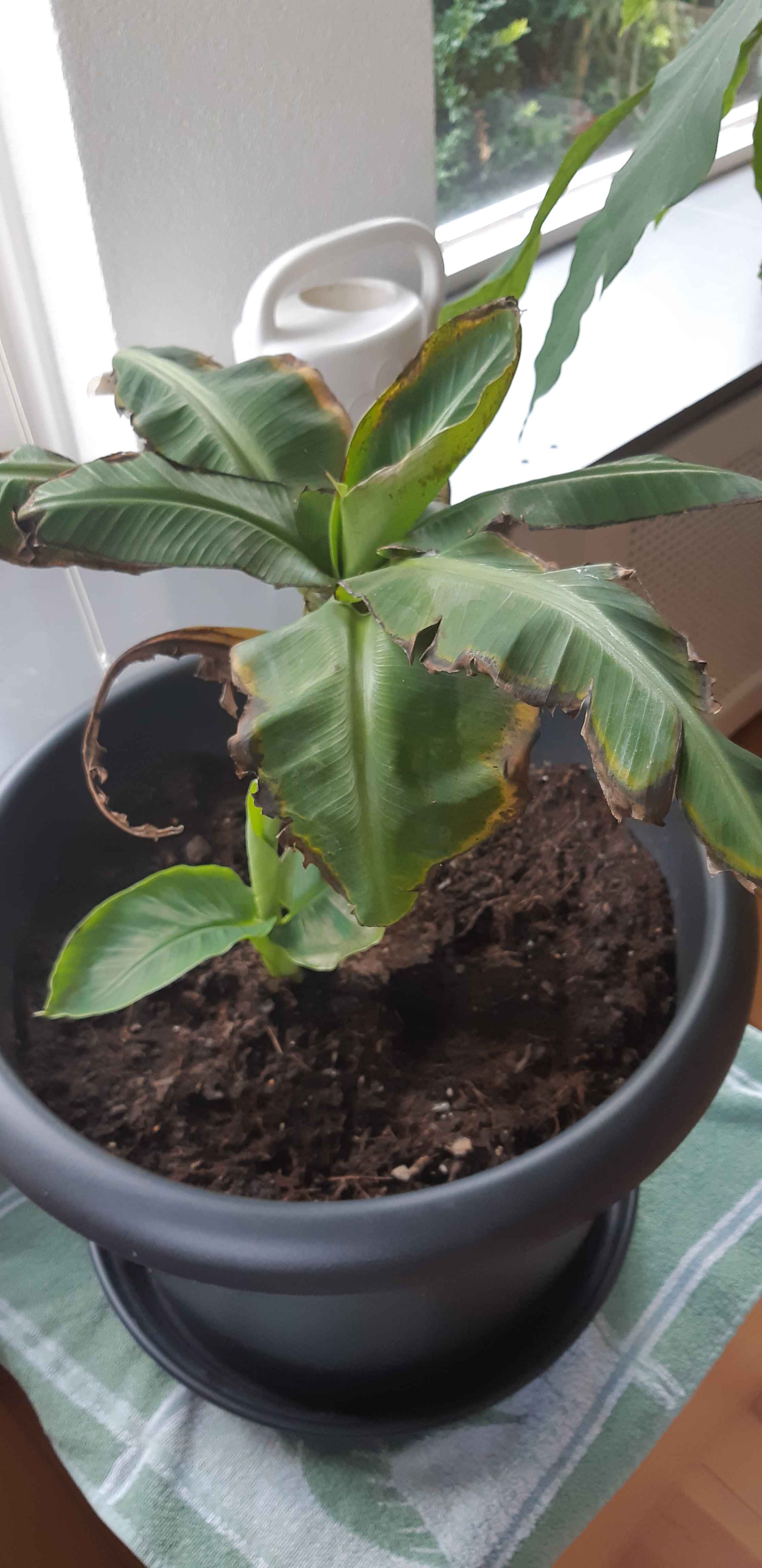 Naar buiten met die hap wel voorzichtig met felle zon en veel water geven bananen verzuip je niet zo snel.