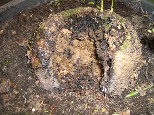 Hier hetzelfde Hent, de stam afgezaagt (20cm doormeter)en de kern van de stam is rot ,heb er al drie jongen Maurelli's, die nu ook in groei zijn afgehaald.