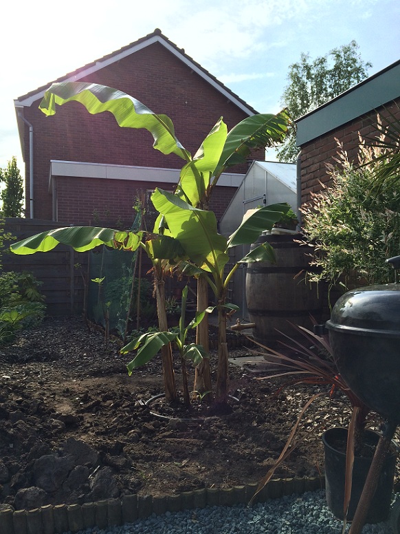 Gistermiddag (eindelijk) mijn grootste musa Basjoo buiten in de tuin gezet.