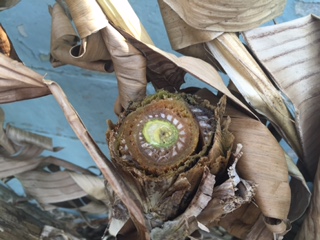 Door de tweede slappe winter op een rij bleef mijn Musa Sikkemensis zonder bescherming over. Door de warmere dagen nu kon ik het niet laten te checken of ze het echt overleefd hebben en heb ik ze afgetopt. De bovenkant was namelijk verdord/bevroren/omgeslagen, dus dat leek me niet bevorderlijk voor het opnieuw omhoog groeien van de speer.
