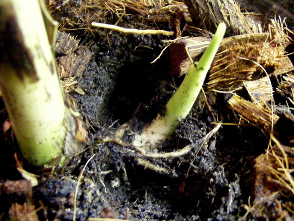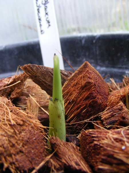 Er komt een kleine glaucum iets (3cm) van de stam uit de grond en begint bladeren aan te maken.