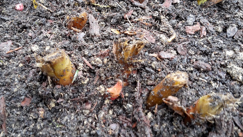 Ik heb gisteren wat zitten opruimen in de tuin, de mulchlaag (bladeren en boomschors) weggehaald van de Hedychium Coronarium.
