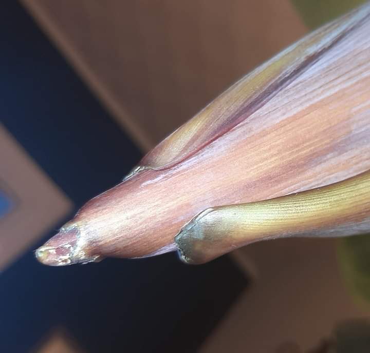 Zoals ik al eerder zei, krult het schutblad op naarmate de banaantjes als een laadklep langzaam naar boven buigen.