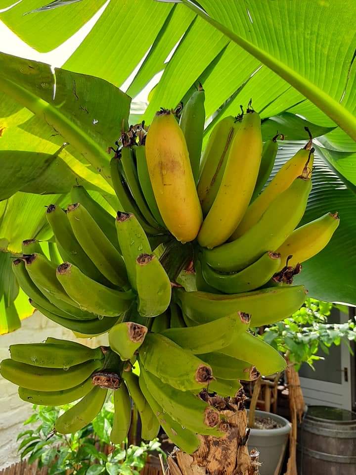 Na 7 maanden hangend en nu dit warme weer!! resulteert in het sneller afrijpen van de bananen direct aan de plant.