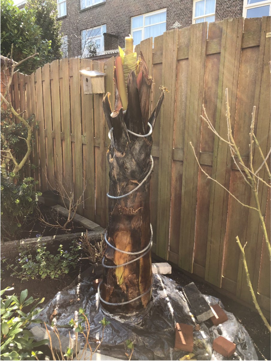 Mijn ensete heeft voor de derde winter op rij buiten gestaan in de volle grond. Leuk vindt hij het niet maar er zit nog leven en groei in. Ik laat hem vandaag een beetje luchten en hopelijk drogen. Daarna alleen een hoes erom ipv vliesdoek en hoes.
