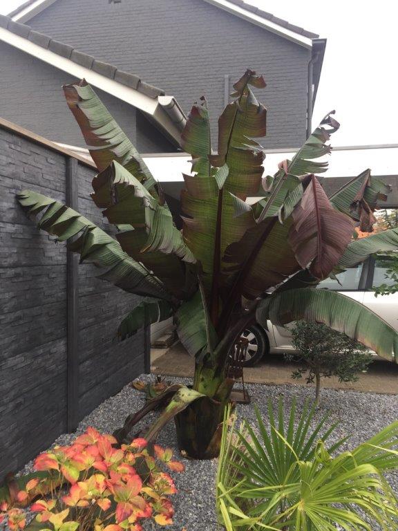 Nu is het door de storm van gisteren en vandaag een grote rafelpartij en is er 1 van de grote Musa sikkimensis stammen omgewaaid. Tevens staat de linker Ensete (waarvan 1 blad helemaal links op de foto staat) nu scheef.