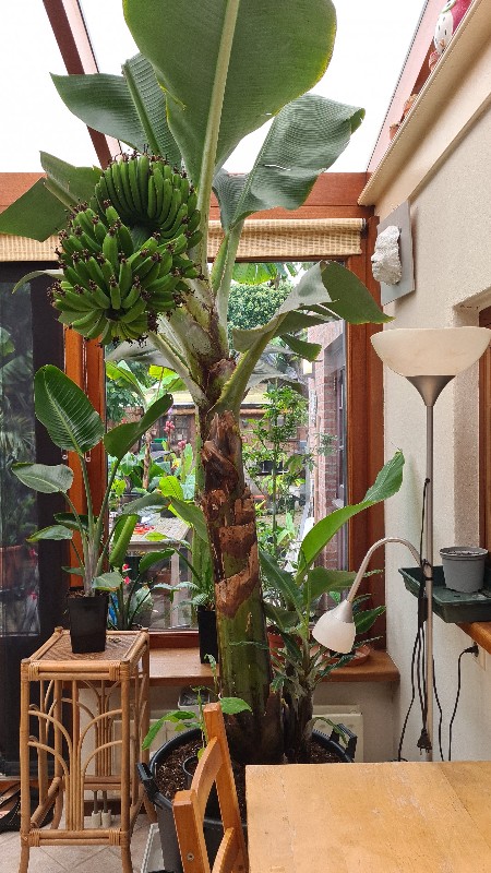 Richard, 104 vrouwlijke banaantjes uiteindelijk 8-) , ziet er vet uit in het holandia met inmiddels een eerste "nachtvorst" vanochtend -1,3C . Het zien van De tros went inmiddels en moet het spectaculaire steeds vernemen van onze bezoekers om weer te beseffen hoe speciaal het eigenlijk is ;) .