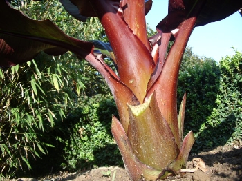 Alle bladeren op 1 na, eraf gesneden. Dit ene blad heeft als taak alle vocht dat nog aanwezig is, op te drinken. De ensete uit de grond steken, de wortelkluit stelt echt bijna niks voor. De 'stam' is misschien wel dikker dan de kluit. De ensete een halve dag op de kop laten uitlekken.